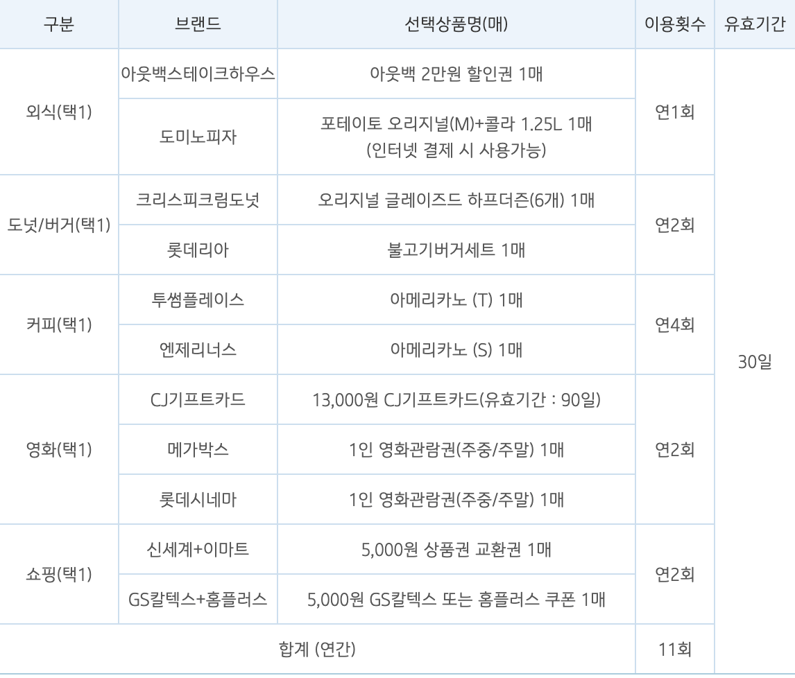 - 통합 일 1회 제공, 전월 이용금액 50만원이상 1회, 100만원 이상 2회, 150만원 이상 3회
