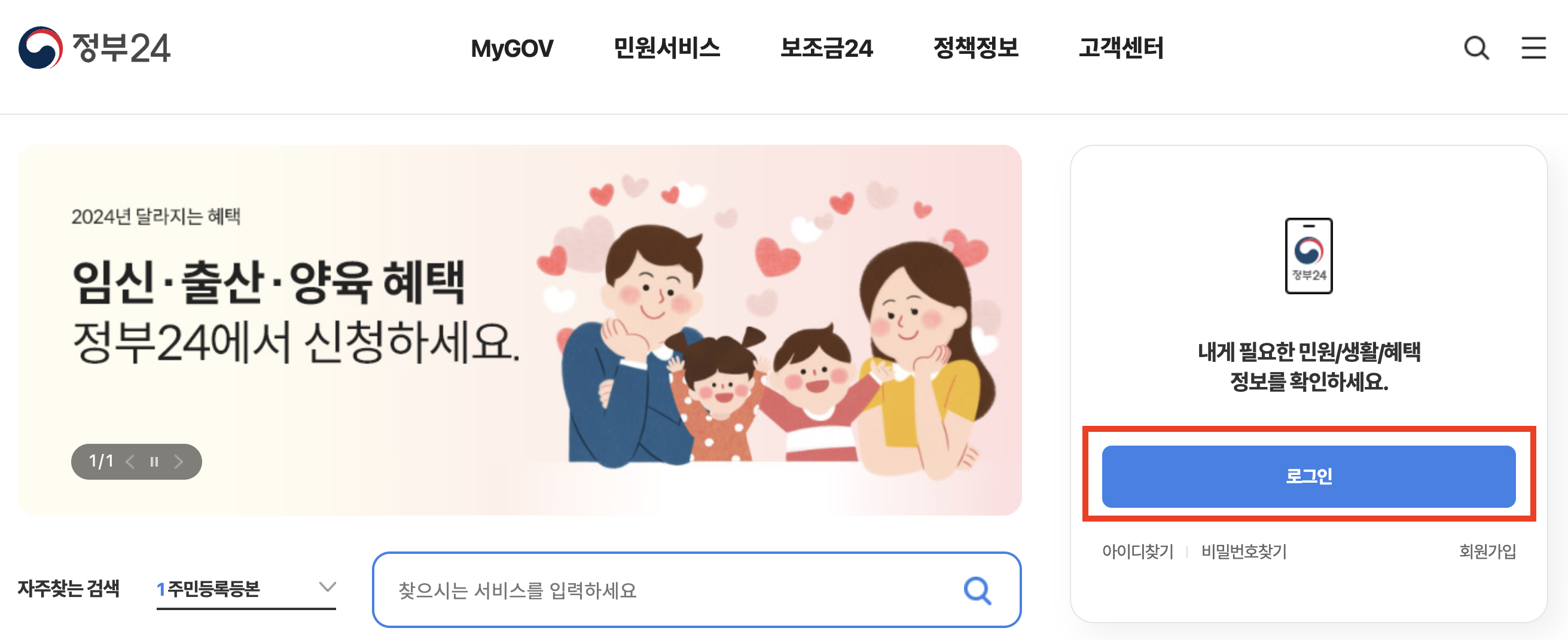 1. 정부24 홈페이지에 로그인을 합니다. 비회원이신 분들은 회원가입을 꼭 진행해주세요!