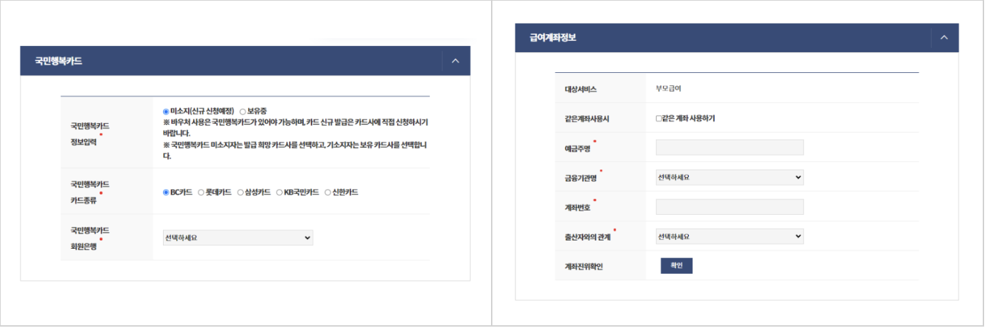 *국민행복카드를 이미 발급 받은 적이 있는 분께서는 해당 카드로 신청하실 수 있습니다. 급여 계좌 정보에는 부모 또는 출산 영유아 중 원하는 명의로 정확히 입력해 주세요.